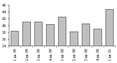 Обращает внимание, что при таком определении результата финансового посредничества ни в одном квартале с 1 квартала 1999 года по 1 квартал 2001 года доля банков с положительным результатом не превысила 50%. Наивысший результат был получен в 1 квартале 2001 года, когда положительный результат финансового посредничества показали 44,7% банков. В среднем же за указанный период положительный финансовый результат наблюдался у 40,6% банков.