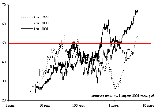 Распределение российских банков по размеру активов на 1 апреля 2001 года.